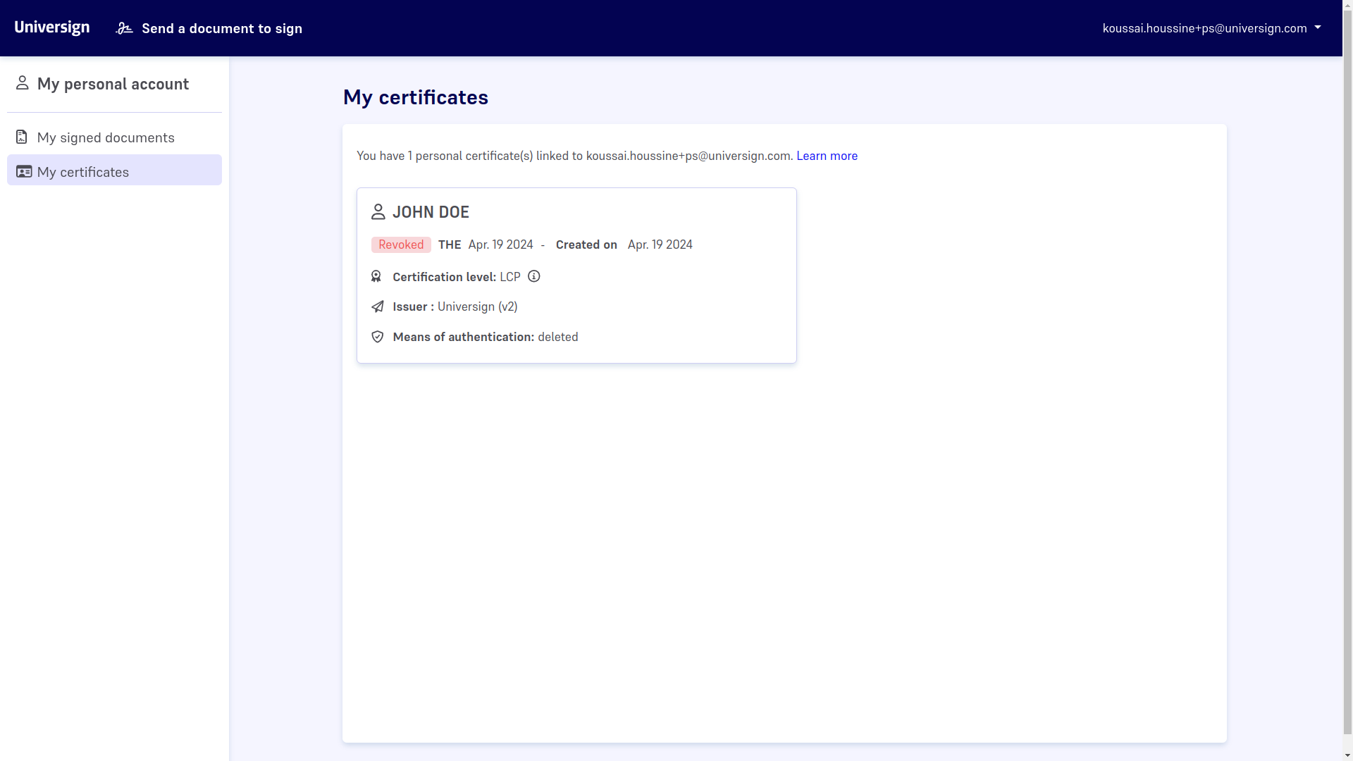 Ten en cuenta que si revocas un certificado, este seguirá mostrándose en tu Espacio Personal, pero ya no podrás usarlo.